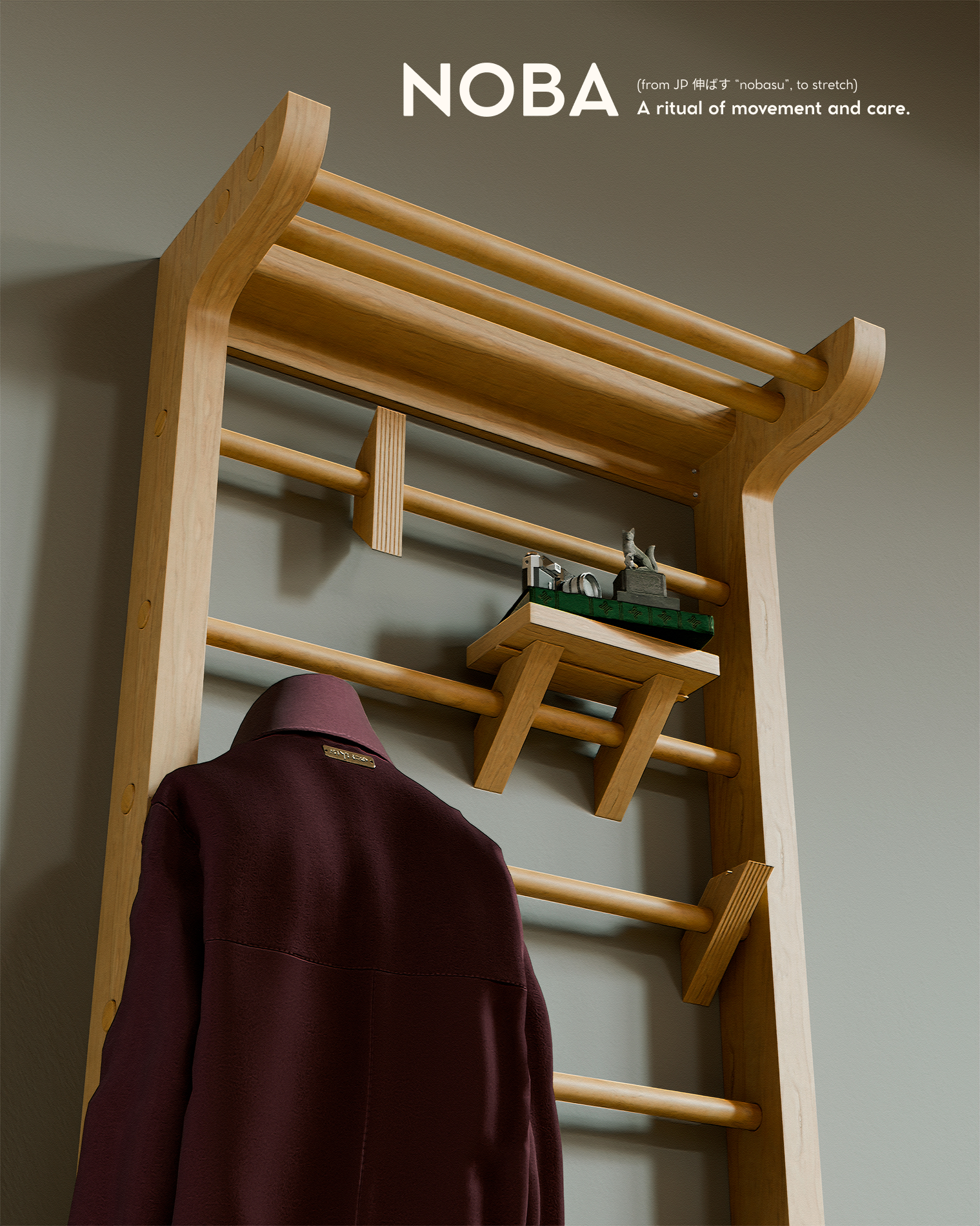 Noba transforms the home’s entrance into a quiet ritual of movement and care. By integrating coat storage with a dedicated stretching tool, it invites a daily pause to breathe, reconnect with the body, and build a lifelong habit of well-being.